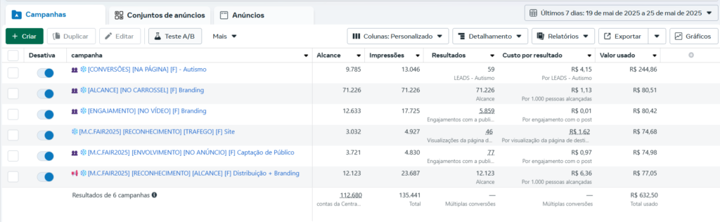Relatório Semanal METApor fernandodefaria.com@gmail.commaio 26, 2025maio 26, 2025 Confira abaixo o desempenho detalhado das campanhas: